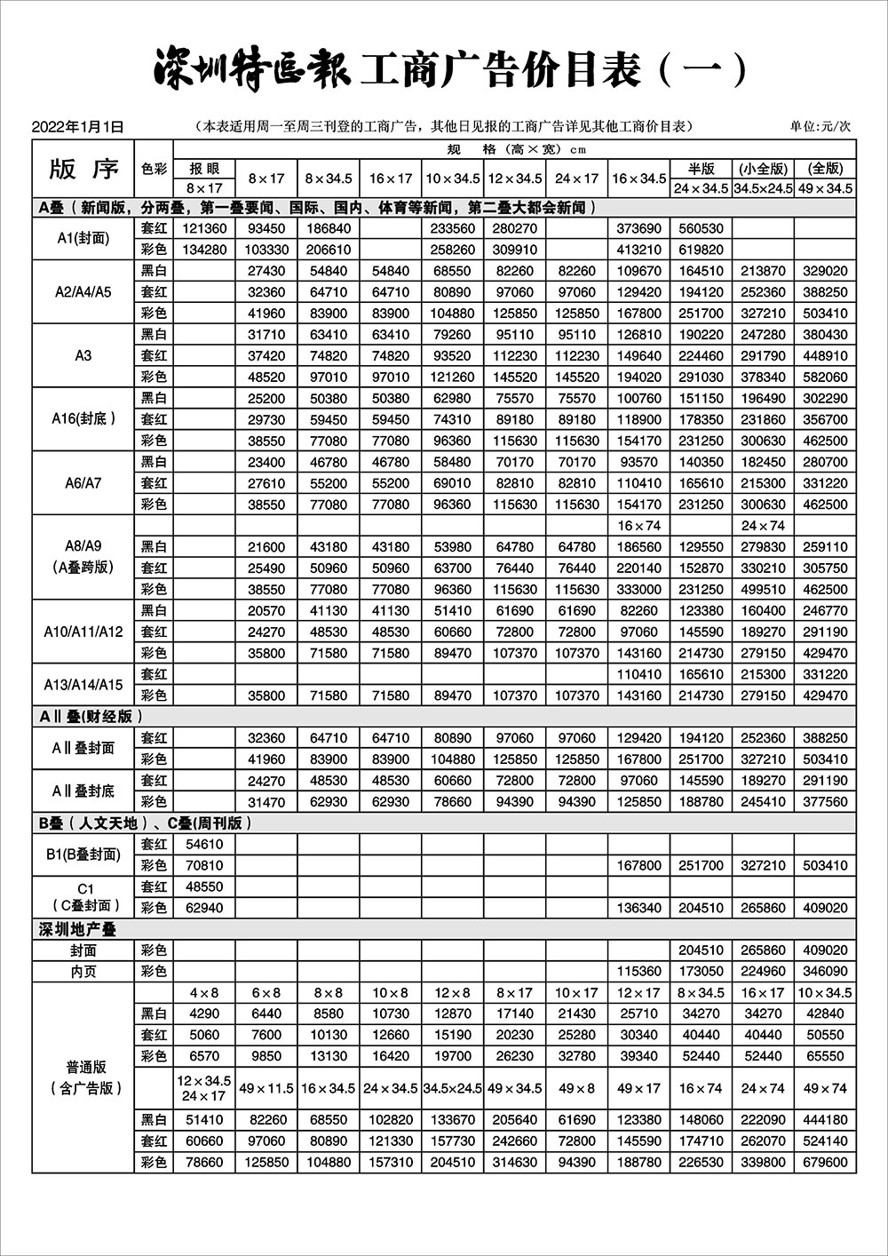 深圳特區(qū)報工商廣告價目表