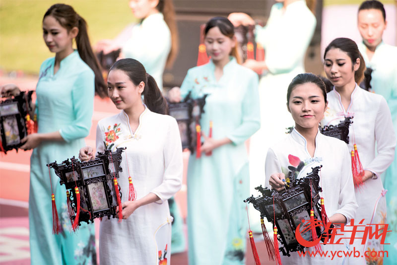昨日廣府廟會的一景。這種打扮與所持宮燈式樣,明顯是現(xiàn)代導演對傳統(tǒng)的發(fā)展與模仿,但也可能形成新的民俗 記者 周巍 攝