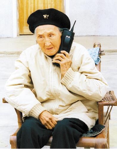 王琛攝影作品。1993年3月,湖南省寧鄉(xiāng)縣南田坪鄉(xiāng)宜坪村,王琛從廣州回到湖南見(jiàn)奶奶,奶奶毛氏用王琛的手機(jī)與他父親通話。