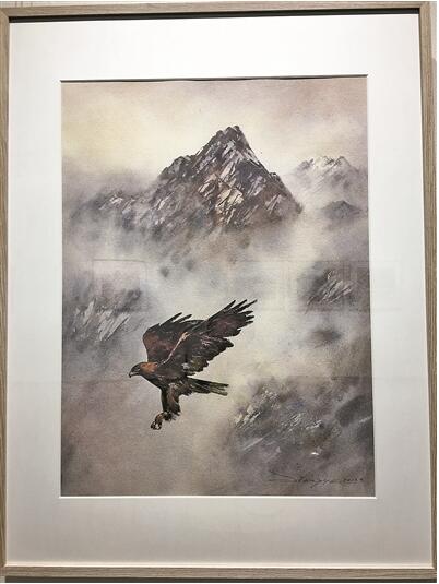 雄鷹展翅翱翔、盤旋于海灣、高山的上空,這是蔣燁教授水彩畫中的場景。概括凝練的風景,氣度非凡的飛鷹,一動一靜間把融合中國傳統(tǒng)文化的現代水彩語境表現得酣暢淋漓。開幕當天,蔣燁將畫作《?!棥焚浰徒o了龍崗區(qū)人民政府。
