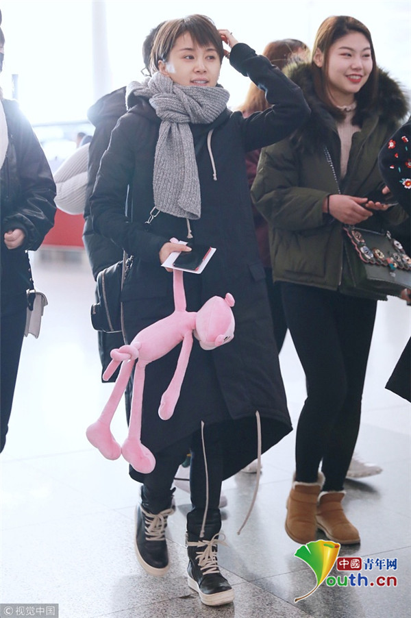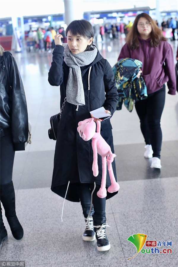 2017年12月10日,北京,王子文現(xiàn)身機(jī)場(chǎng),裹圍巾羞澀撓頭,少女感十足,提溜粉絲所贈(zèng)“粉紅豹”童心未泯。
