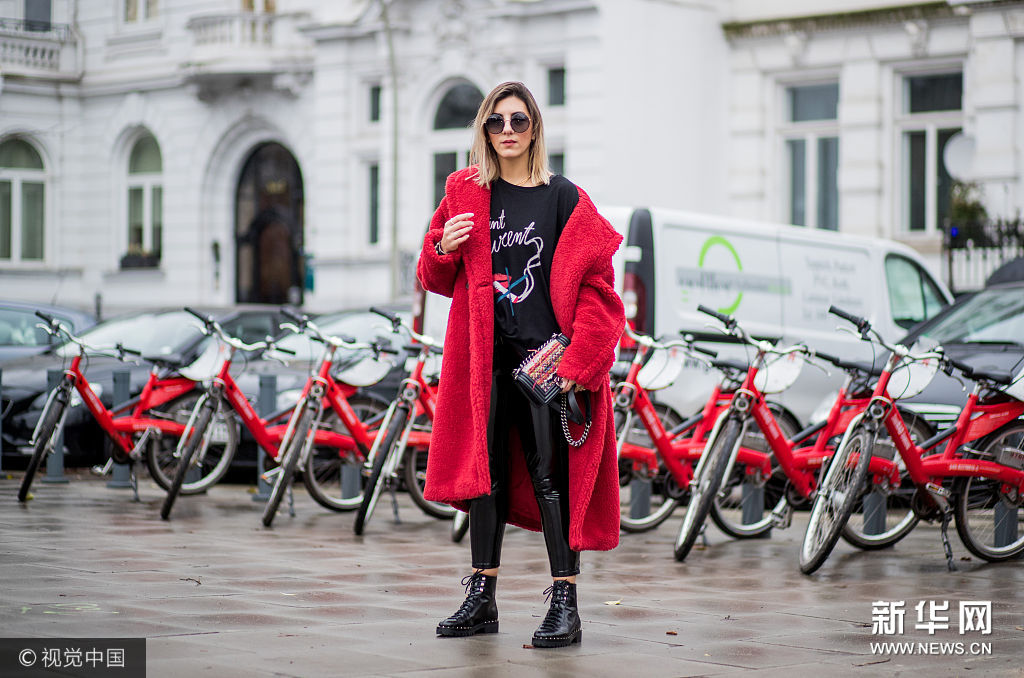 ??? 當(dāng)?shù)貢r間2017年12月5日,德國漢堡,時尚博主Aylin Koenig街拍。她戴Dolce & Gabbana黑色圓框墨鏡,身穿Max Mara紅色羊羔毛大衣,內(nèi)搭Saint Laurent黑色字母紅唇印花衛(wèi)衣,手拎Chanel粗呢拼接鏈條包,下穿Asos黑色漆皮緊身皮褲,腳踩Valentino黑色金屬釘鑲嵌系帶短靴。