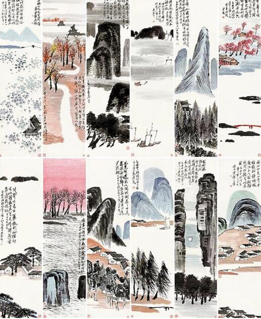 《山水十二條屏》每條屏形制整齊劃一,均為縱180厘米,橫47厘米,內(nèi)容包括:《江上人家》《石巖雙影》《板橋孤帆》《柏樹森森》《遠岸余霞》《松樹白屋》《杏花草堂》《煙深帆影》《杉樹樓臺》《山中春雨》《板塘荷香》《紅樹白泉》。當(dāng)把它們置于一處,便可以完整地呈現(xiàn)出齊白石筆下的美好家園情景——長天落日、桂林山水、浮萍山影、小橋流水,濃郁的東方家園情愫撲面而來。據(jù)悉,存世的《山水十二條屏》僅有兩套,另一套現(xiàn)收藏在重慶博物館。