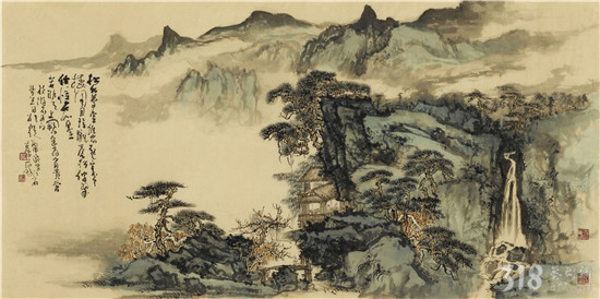 范陽先生的山水畫,筆法近取傅抱石、黃秋園,遠(yuǎn)溯“元四家”中黃公望、王蒙。筑居楊岐山下,使先生日夜親近自然山水,吐納天地,養(yǎng)浩然之氣?!巴鈳熢旎械眯脑础?,唐代張璪一言道破了山水畫家修養(yǎng)、悟性的不二法門。范陽先生正是以自然(造化)為營養(yǎng),入而為心靈化育,镕冶成亦古亦新,遠(yuǎn)離塵俗的獨(dú)特風(fēng)格。近作《松風(fēng)泉聲》(五屏聯(lián))氣勢(shì)磅礴,大開大合,細(xì)究又十分謹(jǐn)嚴(yán)。筆墨與丘壑融為一體,既豪放又穩(wěn)健。淺絳青綠的設(shè)色,使畫面有蔥翠欲滴之感??胺Q山水畫中的經(jīng)典。