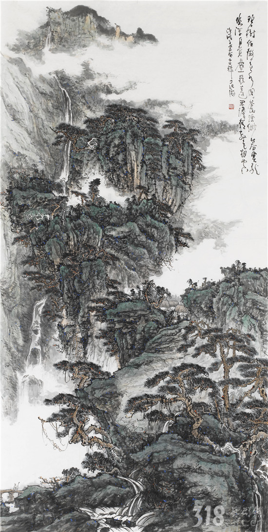 細(xì)品范陽先生的山水,可見他筆墨古厚,意境清新,深得宋元意蘊(yùn)的滋養(yǎng),尤對(duì)王蒙豐茂繁密的畫風(fēng)有著獨(dú)特的理解,于“四王”的筆墨和圖式也諳熟于心。峰巒嵯峨,溪泂蜿蜒,云霧纏繞,松柏掩映,屋舍儼然,這是范陽筆下常見的山居主題。這些景致,既源自于他隱居楊岐山的生活體驗(yàn),也來自于他對(duì)古人山水畫筆墨圖式的不斷玩味、整合,從而構(gòu)成了他理想的山水圖景。不難理解,階段性選擇隱居山林,遠(yuǎn)離喧囂的都市生活,這兩種互補(bǔ)的生活模式為范陽的山水畫帶來了更深層次的思考——傳統(tǒng)與現(xiàn)代、山林與都市之間如何尋求個(gè)人心境與藝術(shù)語言的統(tǒng)一。