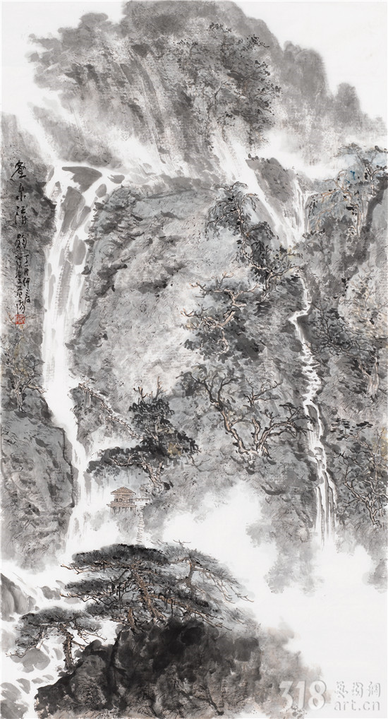 山水之所以成為中國繪畫的永恒主題,跨越時(shí)空,也在于“自然”這一永恒主題是人類心中的凈土。與卡拉揚(yáng)所說的以巴赫音樂“校正視聽”同出一轍,山水藝術(shù)家籍借山水畫,作為修煉自我的一條途徑。與音樂一樣,山水畫既有抽理的邏輯,又有造化的邏輯。師造化能有溫度,抽理能讓我們的心靈得到升華與純凈,我們的手、眼、心在師造化和抽理中,最后達(dá)到師物游心、物我兩忘之境。范陽先生終年隱居江西武功山和楊岐山,師造化使他筆下的丘壑、林泉、松石,高曠而有真意,不落程式窠臼。早年潛心古法研究,謙遜問學(xué),轉(zhuǎn)益多師。門庭既闊,筆墨則不得不精,眼界既寬,格調(diào)則不得不高。近年的作品,更從早年的細(xì)膩綿密,化而為奔放渾厚。其畫不論大作或小品,首取氣韻,不營營于一草一木,放逸中卻又能見綿密細(xì)致。又以草情筆法入畫,于平直處流露其錚錚骨骼及磊磊性情,飛動(dòng)處可見其心瀾翻動(dòng),觀其作,可想見其作畫時(shí)心手雙暢之態(tài),如汩汩之泉,一瀉千里而不得止,非長年積養(yǎng)之功不可得哉。