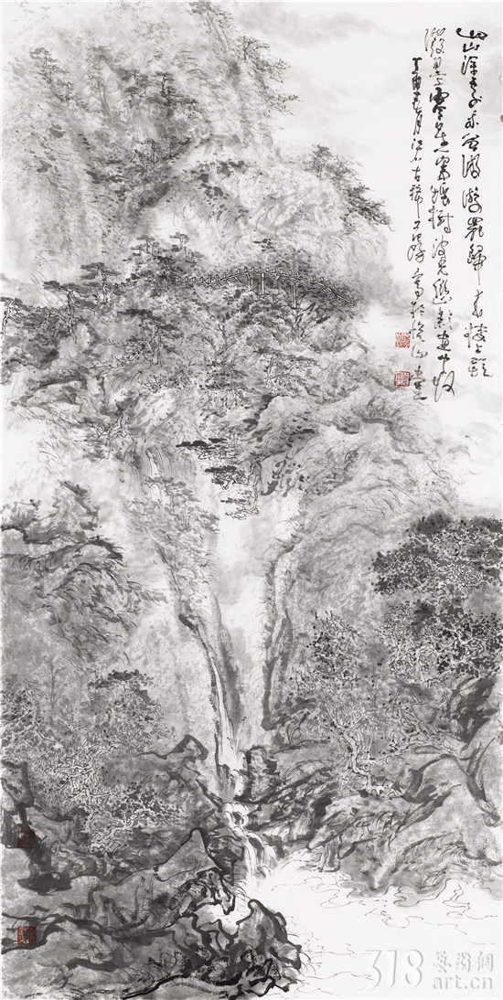 我以為,范陽先生是真正在心性上貼近古人“不下堂筵,坐窮泉壑”,其現(xiàn)居贛中名岳武功山、楊岐山之中。尤其武功山,史上與衡山、廬山并稱江南三大名山,被冠以“衡首廬尾武功中”,山脈綿延浩瀚,茫茫無際。范陽先生終日面山臨壑,弄筆自適,得武功真容。山水畫從來就不是簡單的描摹自然的風(fēng)光,無論丘園養(yǎng)素還是泉石嘯傲,都是畫者精神的自然流露,這是畫家筆墨情態(tài)的表達(dá),亦是畫家藝術(shù)境界追求的體現(xiàn)。對(duì)于山林的描繪,承載了畫者對(duì)泉石意趣的向往,對(duì)于林下境界的追求。范陽先生的山水畫作品長于布景,對(duì)山中的“陰、晴、朝、夕”的細(xì)膩描繪都有他自已獨(dú)特感悟和表達(dá)。筆下極丘壑浩渺之勢(shì),奇峰羅列,宛有風(fēng)骨,深壑幽谷,其勢(shì)超峻;至于松柏掩映,峭壁涌泉,野道幽麓,于野逸之態(tài)甚備。范陽先生數(shù)十年來遍臨南北宗諸家,遠(yuǎn)溯元人四家,清初四王,近至黃秋園,上下求索,崇穆有加,最終歸皈真逸正脈。新近年逾七十之作,日漸精熟,蒼腴古厚,更趨融古化古之態(tài),細(xì)究其筆下蹤跡:子久?麓臺(tái)?秋園?各不相肖,而莫不精備。諦觀其中景象:匡廬?武功?羅霄?渾然而化,不一而足。如此境地當(dāng)稱“妙解”。