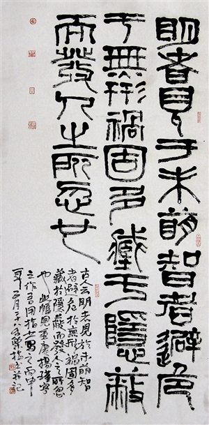 王和平以手指蘸墨,以手為筆,或疾或緩,不到十分鐘,一幅恰似石鑿雕刻力透紙背的書法作品躍然紙上,其變幻莫測的創(chuàng)作手法和獨(dú)特風(fēng)格令人叫絕。顯然,用手指畫的難度比用筆畫大得多。一般書寫一個(gè)字需要用手指蘸墨幾次以上,但又必須使字形整體合理自然,筆畫形式流暢靈動,不至于顯露手工痕跡,不至于給人以呆滯和工藝性強(qiáng)的感覺。要恰到好處地體現(xiàn)筆畫的緊湊、粗細(xì)、虛實(shí)、枯榮,是一件很不容易的事。功夫全在指頭,既非一日之功,也非人人可以練就。