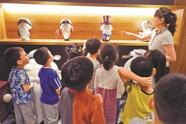 “儒·時光”極具藝術性。一尊大大的hello kongzi雕塑通過3D投影呈現(xiàn)不同的視覺效果,流光溢彩,熠熠生輝。“漢字傳奇”則是通過游戲的方式,向觀眾介紹甲骨文的由來,十二生肖的甲骨文從光影墻上落下,觀展者觸摸,這個生肖字即變成對應的動物,演變過程十分生動,漢字的“象形”性由此可見一斑。新增的展覽項目為“hello kongzi國學角”,參觀者可通過平板電腦里的博林文創(chuàng)自主研發(fā)的二十四節(jié)氣小游戲、詩詞動畫游戲等走進傳統(tǒng)文化。在當日的參觀活動中,小朋友們感到十分新鮮好奇,尤其被游戲屬性強烈的“上下五千年”“漢字傳奇”牢牢吸引。而可愛的hello kongzi形象也讓他們覺得十分親切,傳統(tǒng)文化的種子不知不覺地埋在了心田。