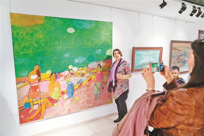 參觀者在油畫展上留影。新華社發(fā)