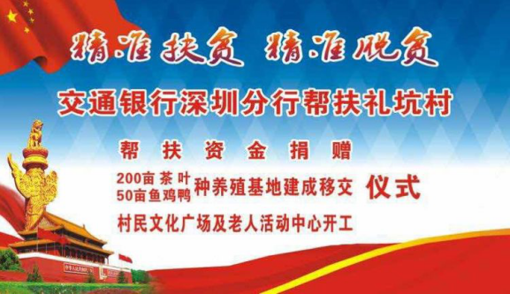 自交通銀行深圳分行對(duì)口幫扶禮坑村,開(kāi)展"雙精準(zhǔn)"扶貧以來(lái),禮坑的經(jīng)濟(jì)社會(huì)發(fā)展和村容村貌發(fā)生顯著變化,積貧積弱的小山村呈現(xiàn)欣欣向榮的新氣象。積土成山、積水成淵,200畝茶山破土而出、蔚然成綠,50畝養(yǎng)殖基地竣工落成、生機(jī)勃勃,三萬(wàn)魚(yú)苗、數(shù)千雞苗茁壯生長(zhǎng),村民文化廣場(chǎng)、老年活動(dòng)中心、道路硬底項(xiàng)目、山村亮燈工程躍然紙上,逐次開(kāi)工建設(shè),禮坑正創(chuàng)造并綻放新的希望,村民笑容淳厚,各級(jí)由衷點(diǎn)贊。紫金縣領(lǐng)導(dǎo)、縣扶貧工作總負(fù)責(zé)人廖振輝表示:"交通銀行深圳分行是真重視、真扶貧、扶真貧,在對(duì)口紫金的扶貧單位中首屈一指,無(wú)論在河源市的扶貧工作考評(píng)中,還是在代表河源參加的廣東省扶貧工作考評(píng)中,雙雙獲得優(yōu)秀評(píng)價(jià),真誠(chéng)感謝交行,紫金要和交行一起努力,讓禮坑成為社會(huì)主義新農(nóng)村示范村建設(shè)中的示范點(diǎn)"。