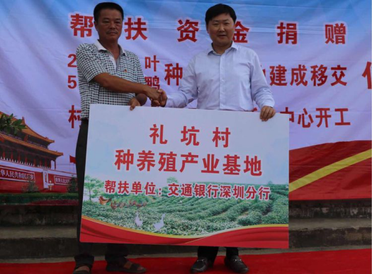 當(dāng)日,交通銀行深圳分行籌劃建設(shè)的茶山、種養(yǎng)殖基地、新一批雞苗和2017年度專(zhuān)項(xiàng)扶貧資金正式移交和撥付給禮坑村,并舉行了村民文化廣場(chǎng)開(kāi)工奠基典禮。陳隃表示,交行深圳分行把幫扶禮坑村做為落實(shí)黨的政策的重點(diǎn)工作,做為國(guó)有銀行承擔(dān)政治責(zé)任、社會(huì)責(zé)任的重要出發(fā)點(diǎn),做為加強(qiáng)黨的建設(shè)的重要抓手,下一步圍繞三個(gè)轉(zhuǎn)變繼續(xù)深化扶貧工作,一是工作目標(biāo)轉(zhuǎn)向社會(huì)主義新農(nóng)村建設(shè),努力將禮坑村建設(shè)成新農(nóng)村建設(shè)示范村中的示范點(diǎn);二是工作方法從貧困戶(hù)脫貧向產(chǎn)業(yè)脫貧轉(zhuǎn)變,繼續(xù)發(fā)掘新項(xiàng)目,形成更加持續(xù)化的產(chǎn)值和收益;三是在制度建設(shè)上下功夫,強(qiáng)化社會(huì)主義新農(nóng)村建設(shè)的制度先行和制度示范。