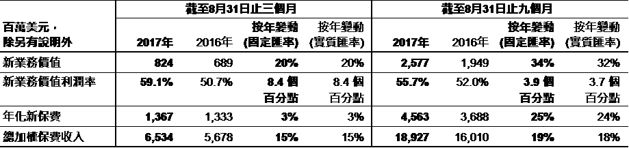 友邦保險三季度主要財務(wù)概要