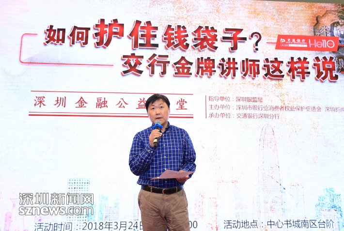 3月24日,在深圳中心書城南臺(tái)階,由深圳銀監(jiān)局指導(dǎo),深圳新聞網(wǎng)、深圳市銀行業(yè)消費(fèi)者權(quán)益保護(hù)促進(jìn)會(huì)主辦,交通銀行深圳分行承辦的大型系列公益活動(dòng)“深圳金融公益講堂”第四講如期開講。活動(dòng)邀請(qǐng)了來自交通銀行深圳分行的三位金牌講師從專業(yè)角度為市民朋友們?cè)敿?xì)講解理財(cái)知識(shí),現(xiàn)場(chǎng)解答市民的金融消費(fèi)困惑。