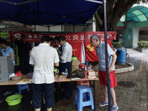 社區(qū)工作人員向居民介紹便民服務(wù)活動(dòng)