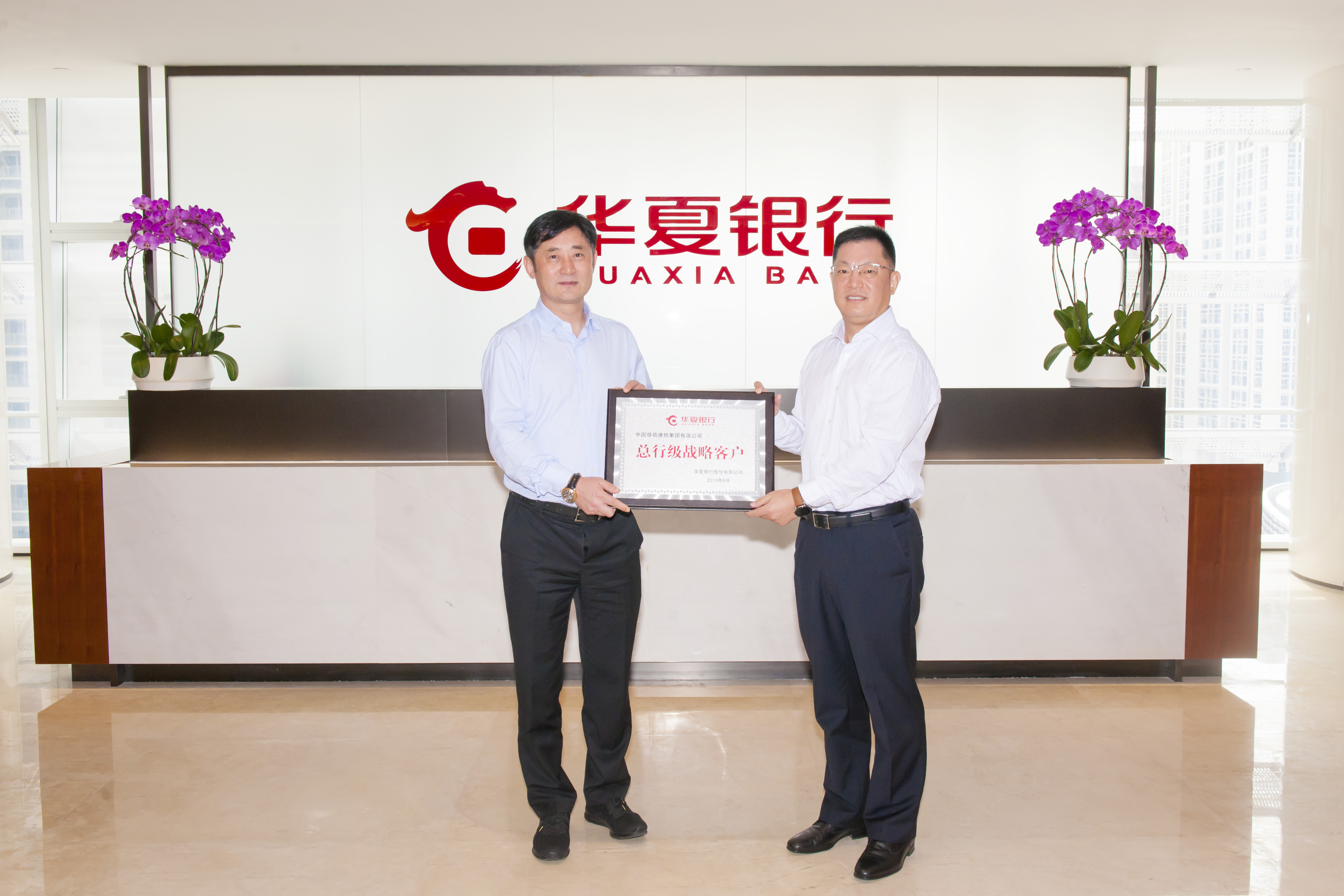 簽約儀式前,華夏銀行深圳分行受總行委托向中國移動(dòng)通信集團(tuán)有限公司頒發(fā)“總行級(jí)戰(zhàn)略客戶”牌匾。