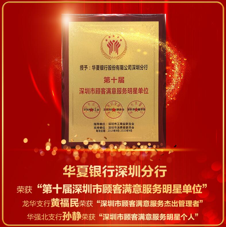 深圳新聞網(wǎng)訊 近日,華夏銀行深圳分行在“第十屆深圳市顧客滿意服務(wù)明星”暨“第二屆深圳市優(yōu)質(zhì)服務(wù)示范單位”評選活動中,榮登“深圳市顧客滿意服務(wù)明星單位”榜首,“華夏服務(wù)”品牌影響力再次得到行業(yè)和客戶的高度認(rèn)可。同時(shí),該行龍華支行行長黃福民、華強(qiáng)北支行副行長孫靜分別獲得“深圳市顧客滿意服務(wù)杰出管理者”和“深圳市顧客滿意服務(wù)明星”榮譽(yù)稱號。