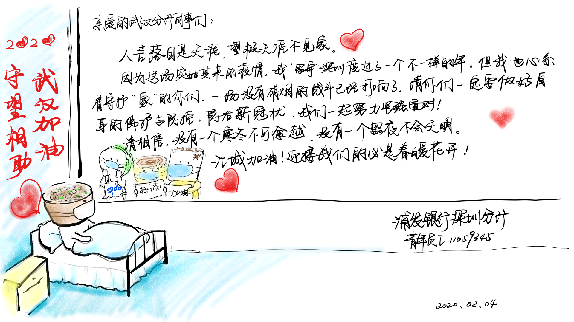 2月3日,浦發(fā)銀行深圳分行團(tuán)委向全體青年員工發(fā)出了一封倡議書。在倡議書中,該行團(tuán)委號(hào)召?gòu)V大團(tuán)干部、團(tuán)員青年立即行動(dòng),充分發(fā)揮黨的助手和后備軍作用,展現(xiàn)青年突擊隊(duì)作為,為堅(jiān)決打贏疫情防控阻擊戰(zhàn)貢獻(xiàn)力量,并向青年提出三個(gè)要求:“堅(jiān)定信心不迷茫,聽黨指揮勇?lián)?dāng)”、“科學(xué)防范不信謠,眾志成城控疫情”、“居家辦公不離崗,服從指揮勇?lián)?dāng)”。當(dāng)日,浦發(fā)銀行深圳分行發(fā)起了給武漢分行同事寄送家書的活動(dòng),該行全體青年手寫家書,圖文并茂、紙短情長(zhǎng),表達(dá)了對(duì)疫區(qū)“戰(zhàn)友們”最深切的關(guān)愛和鼓勵(lì),身體力行做好他們堅(jiān)強(qiáng)的后盾。