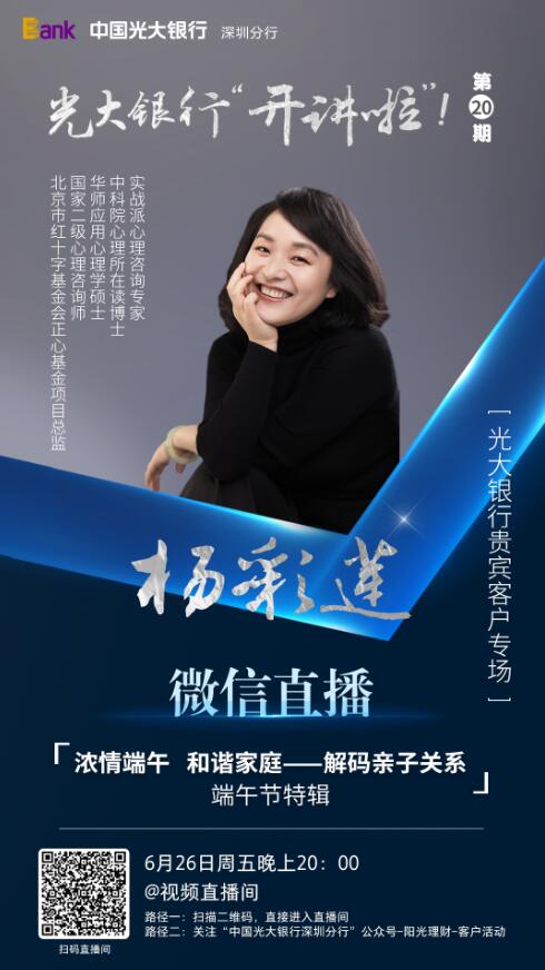見(jiàn)圳客戶端·深圳新聞網(wǎng)2020年6月24日訊 端午節(jié)臨近,光大銀行深圳分行將攜手深圳熱線于6月26日,在線開(kāi)展第二十期《光大銀行"開(kāi)講啦“!》公益課堂。