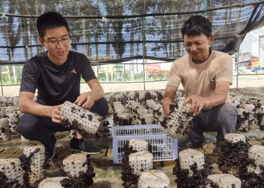 來(lái)自太平人壽新疆分公司的振興村駐村第一書(shū)記,正在查看木耳長(zhǎng)勢(shì)