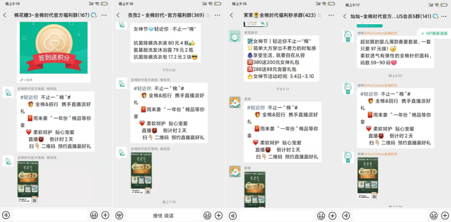 為了提升活動效果以及節(jié)日噱頭,招行深圳分行積極向商戶爭取了全棉時代的直播禮品,直播當天全棉時代為招行用戶提供價值50萬的禮品,同時在宣傳端,為了打造活動熱點,全棉時代在超過500個社群內(nèi)進行活動推送,招行端也積極爭取總行資源,在App、微信視頻號及朋友圈進行宣傳。