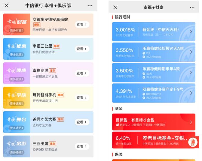 中信銀行“幸福+俱樂部”“幸福+財(cái)富”頁面展示