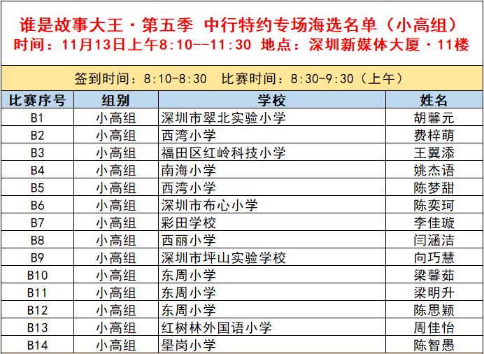 “誰是故事大王·第五季”分為小中組和小高組,此次中行特約專場海選報名的學(xué)生將以脫稿的形式,不限主題,在限時5分鐘內(nèi),講述積極健康向上的故事。評委老師們將從四個維度進(jìn)行評分,其中內(nèi)容占50%、表現(xiàn)技巧占30%、儀態(tài)占10%,以及時間掌控、創(chuàng)意特色呈現(xiàn)等占10%。最終,本場活動將選拔出部分學(xué)生晉級“誰是故事大王·第五季”深圳市復(fù)賽,他們將和來自指定校園分賽區(qū)、特約專場以及線上分賽區(qū)的選手一起爭奪深圳市決賽名額。現(xiàn)將上場順序(即所在小組的序號順序)、名單、簽到時間、比賽時間公布如下: