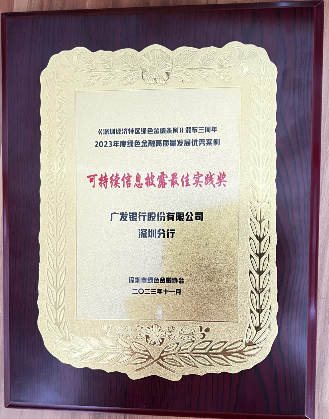 深圳新聞網2023年11月30日訊(記者 朱琳 通訊員 李華鳳)近日,深圳市綠色金融協會組織開展“2023年綠色金融高質量發(fā)展優(yōu)秀案例評選”活動,表彰貫徹落實《深圳經濟特區(qū)綠色金融條例》、推動綠色金融發(fā)展的最佳實踐,以榜樣力量引領綠色金融高質量發(fā)展的典型。廣發(fā)銀行深圳分行榮獲“可持續(xù)信息披露最佳實踐獎”。