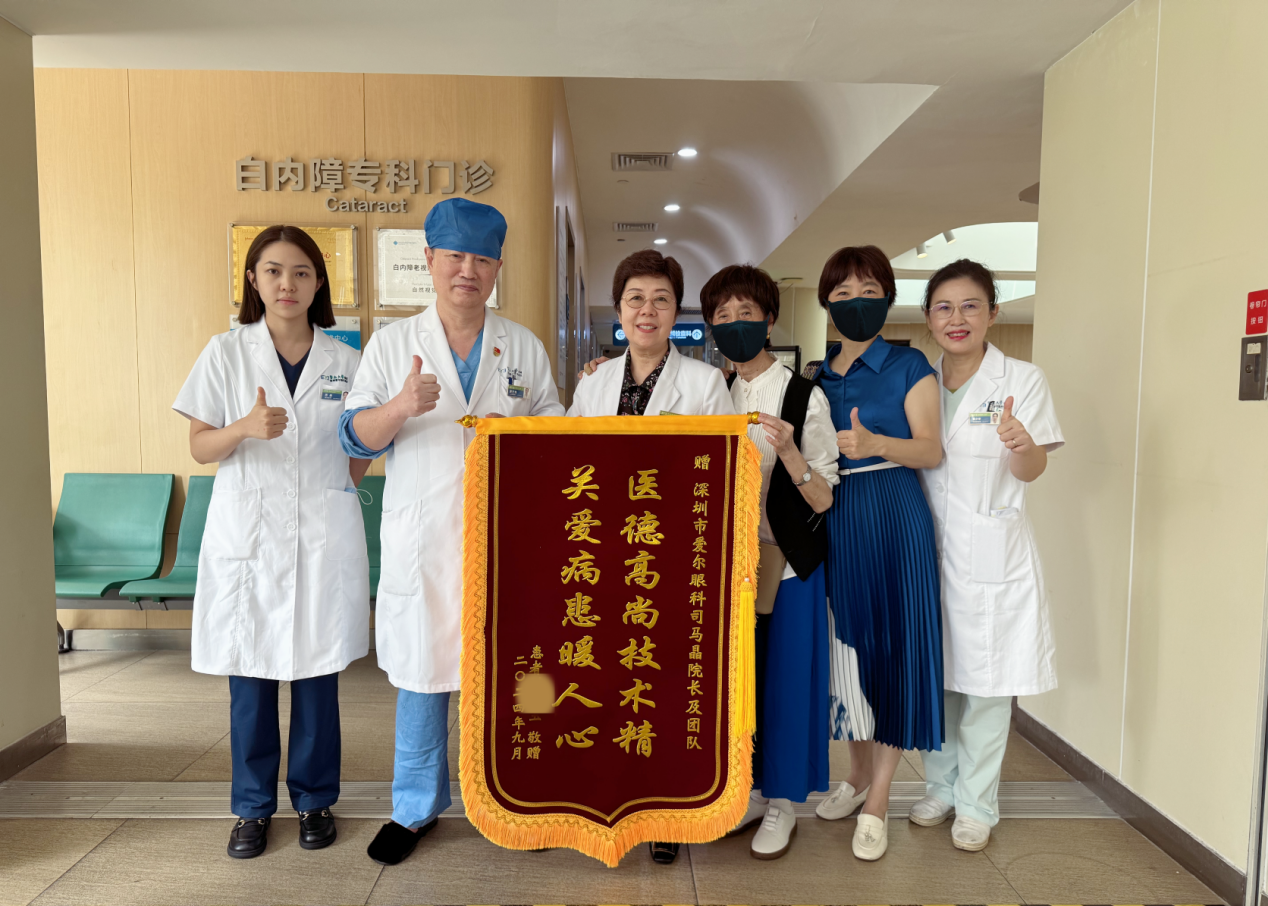 完成手術的劉奶奶心情無比輕松,坐在輪椅上被推出手術室時,她向醫(yī)護人員豎起了大拇指。兩天后,劉奶奶又順利進行了另一只眼的手術。通過飛秒激光輔助白內(nèi)障手術,一次性解決了她的白內(nèi)障、遠視、散光及老視等多種眼病困擾。術后,她為醫(yī)護人員送來錦旗,激動地抱著司馬晶教授道謝:“感謝您治好了我的眼睛,我現(xiàn)在看遠看近都很清楚,真后悔沒有早點做這個手術!”