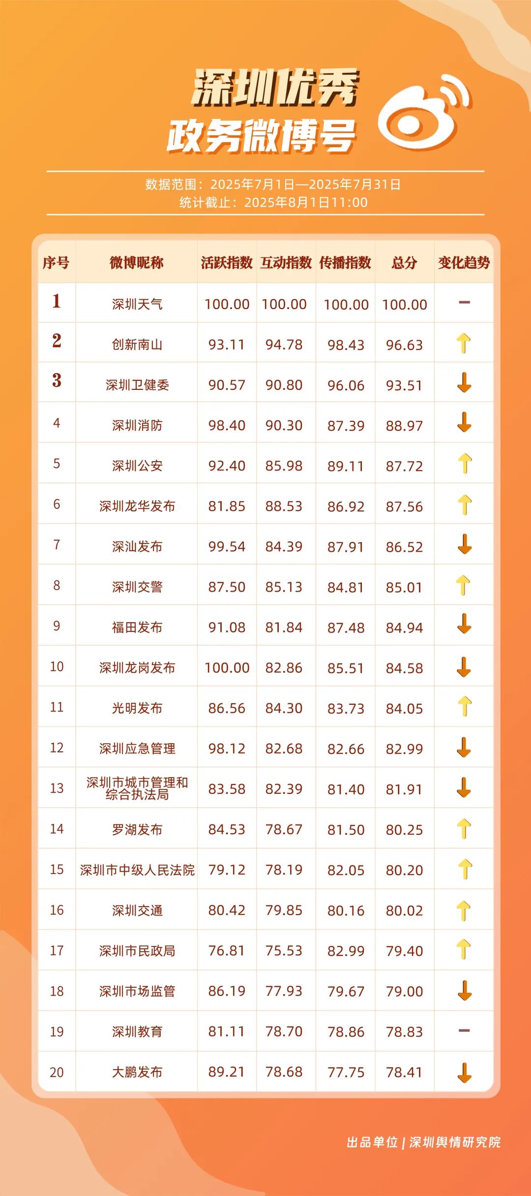 7月,“深圳天氣”“創(chuàng)新南山”“深圳衛(wèi)健委”“深圳消防”“深圳公安”“深圳龍華發(fā)布”“深汕發(fā)布”“深圳交警”“福田發(fā)布”“深圳龍崗發(fā)布”等20個賬號入選“優(yōu)秀政務微博號”。其中,“深圳天氣”以活躍、互動、傳播指數(shù)三項滿分,蟬聯(lián)榜首;“創(chuàng)新南山”以總分96.63躍居第二,排名呈上升趨勢;“深圳衛(wèi)健委”位列第三,評分也在90分以上,其科普信息持續(xù)獲得市民廣泛認可。以上優(yōu)秀的政務微博賬號精準貼合平臺的傳播規(guī)律,用獨特的賬號風格展現(xiàn)各自特色與魅力。