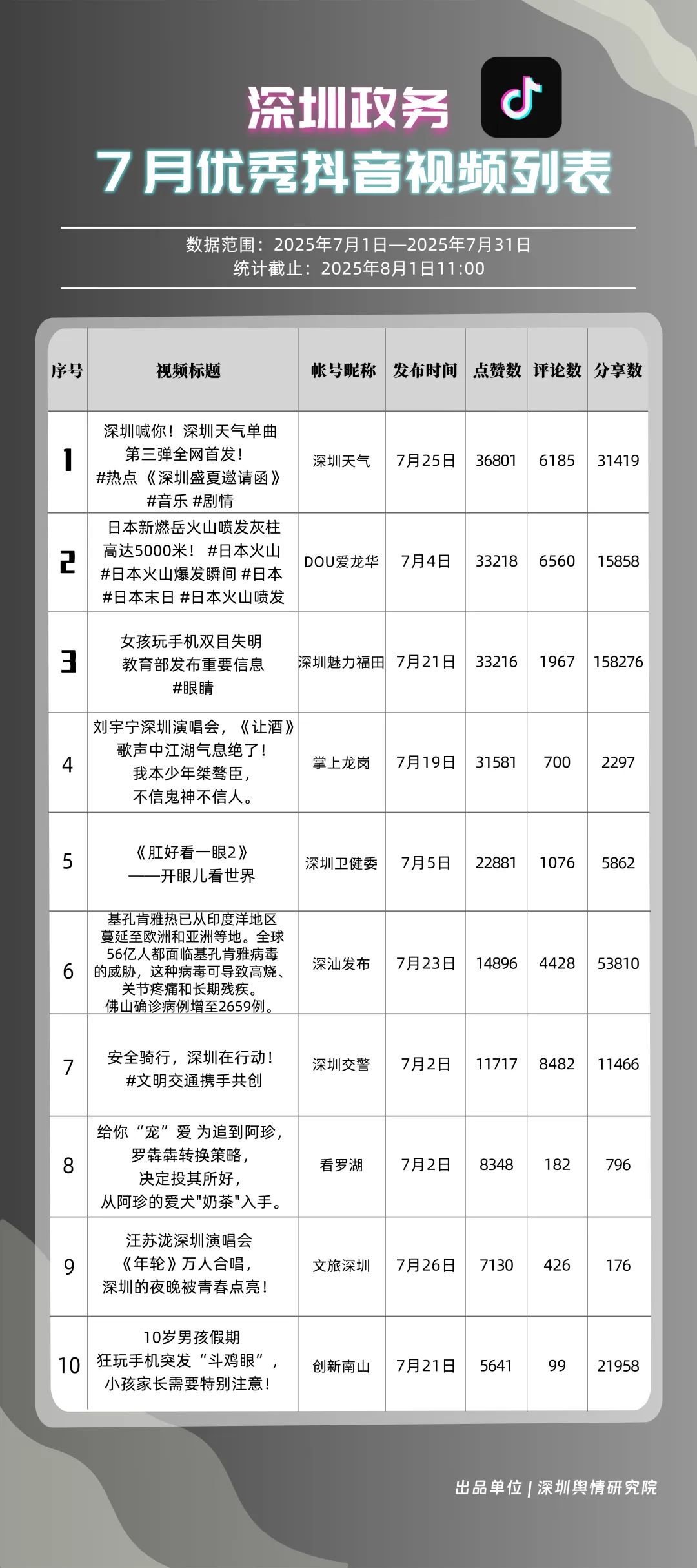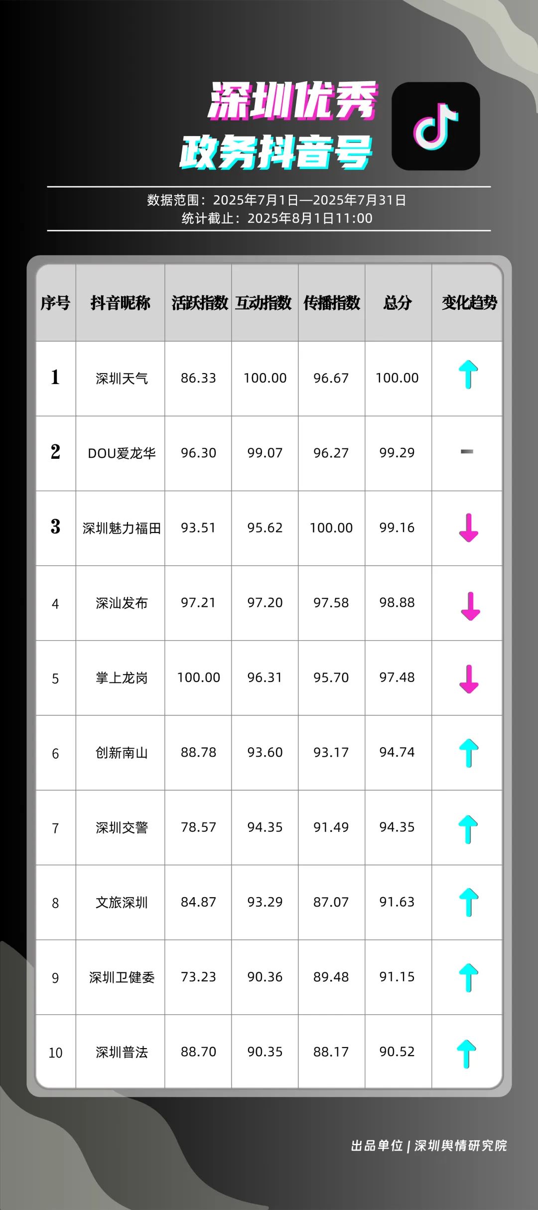 7月,“深圳天氣”“DOU愛龍華”“深圳魅力福田”“深汕發(fā)布”“掌上龍崗”“創(chuàng)新南山”“深圳交警”“文旅深圳”“深圳衛(wèi)健委”“深圳普法”共10個政務抖音號獲得“優(yōu)秀政務抖音號”稱號。其中,“深圳天氣”互動指標獲滿分,憑借氣象與趣味相結(jié)合的創(chuàng)新科普形式,領跑優(yōu)秀政務抖音號;“DOU愛龍華”“深圳魅力福田”分別位列第二、三名,通過聚焦網(wǎng)絡熱點、挖掘創(chuàng)意內(nèi)容,不斷提升傳播效能,展現(xiàn)出強大的政務新媒體影響力;“深汕發(fā)布”“掌上龍崗”“創(chuàng)新南山”等賬號緊隨其后,上榜的優(yōu)質(zhì)政務抖音號用短視頻語言強化傳播效果,展現(xiàn)了鮮明的賬號特色和風采。