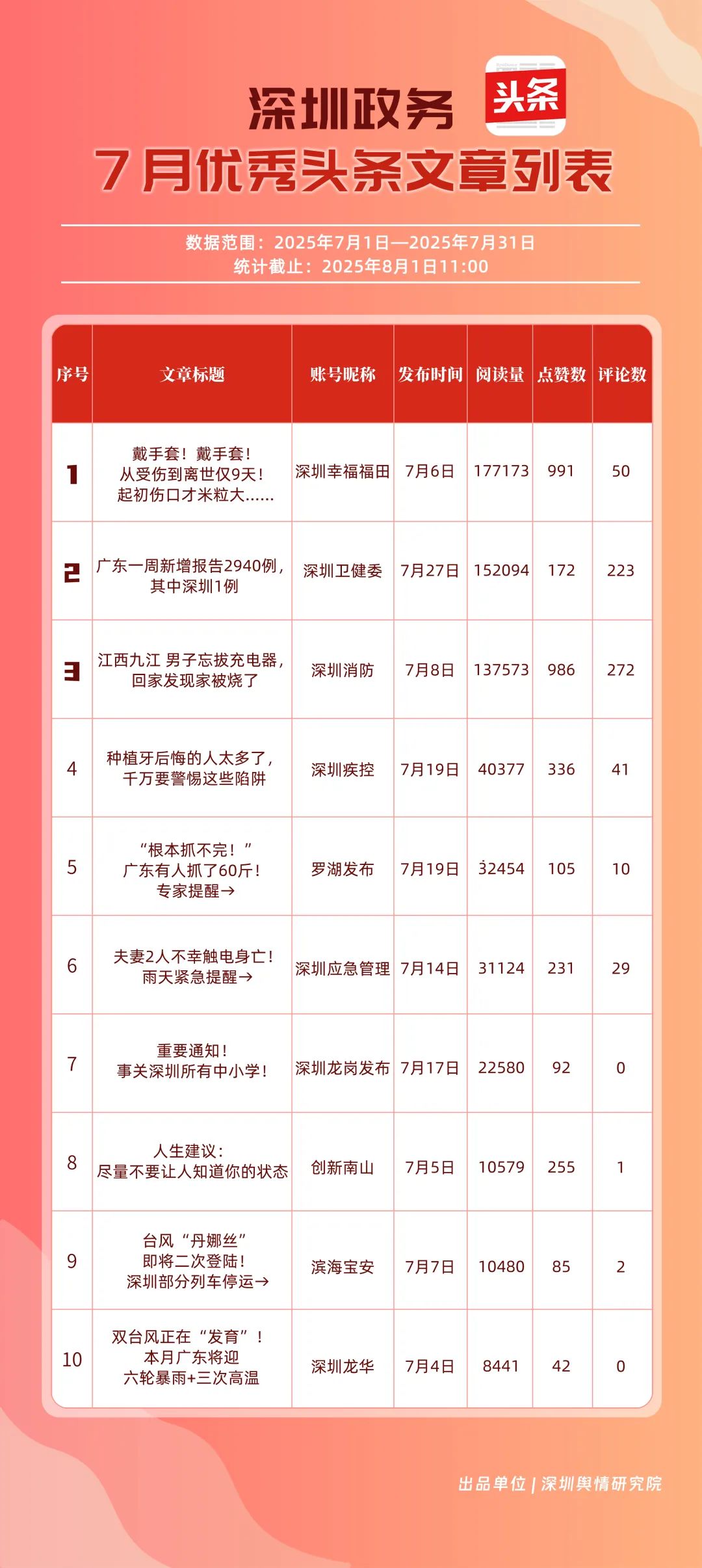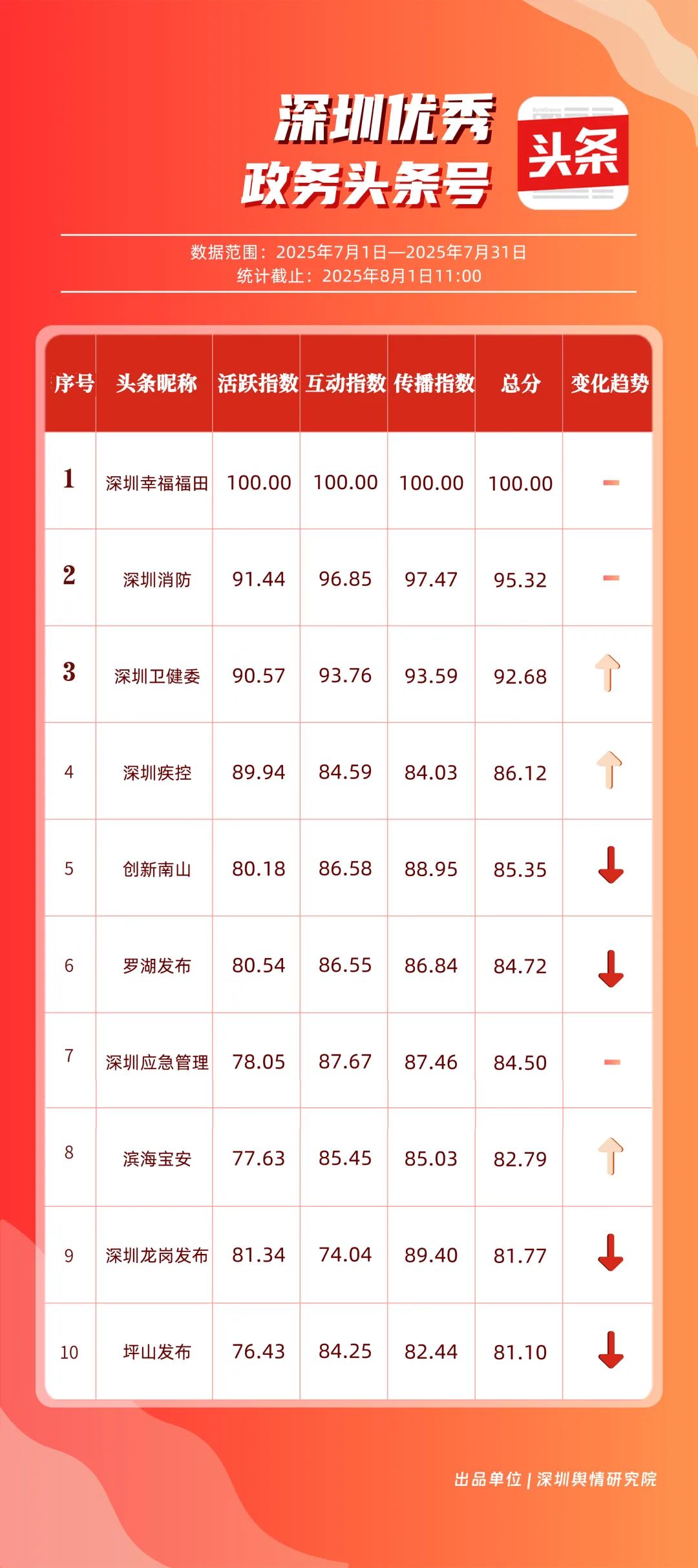 7月,“深圳幸福福田”“深圳消防”“深圳衛(wèi)健委”“深圳疾控”“創(chuàng)新南山”“羅湖發(fā)布”“深圳應急管理”“濱海寶安”“深圳龍崗發(fā)布”“坪山發(fā)布”共10個政務頭條號入選“優(yōu)秀政務頭條號”榜單?!吧钲谛腋8L铩薄吧钲谙馈睉{借優(yōu)質(zhì)內(nèi)容持續(xù)吸引用戶關注,穩(wěn)居前二;“深圳衛(wèi)健委”表現(xiàn)亮眼,評分達92.68分,排名較6月有所上升;“深圳疾控”同樣進步明顯,在疾病預防控制信息傳播上發(fā)揮了重要作用?!皠?chuàng)新南山”“羅湖發(fā)布”“深圳應急管理”等上榜賬號,也各展所長,始終將優(yōu)質(zhì)內(nèi)容作為核心抓手,成為政務新媒體領域內(nèi)容創(chuàng)作與傳播的典范。