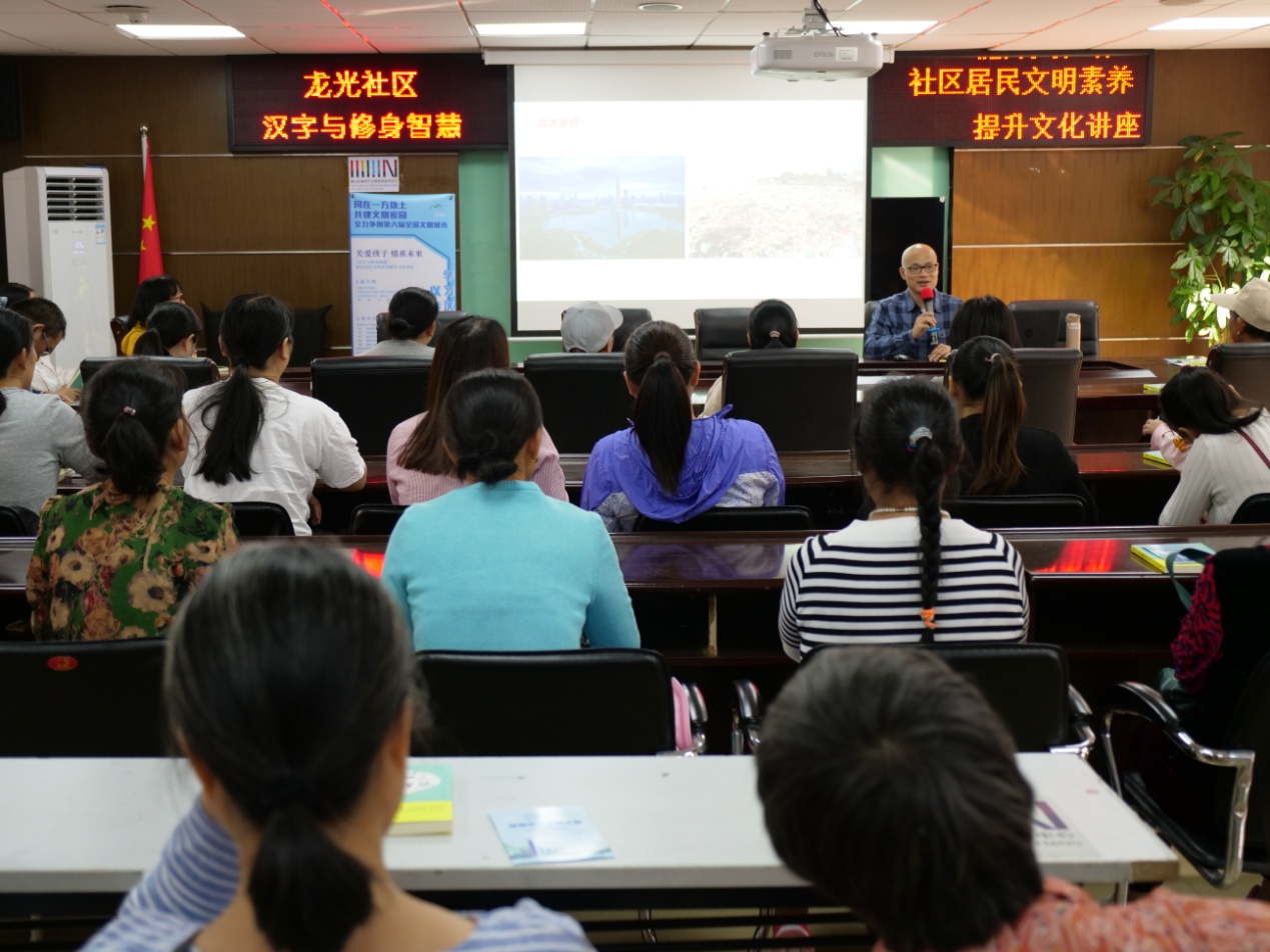 深圳新聞網(wǎng)訊 為更一步提升社區(qū)居民文化素養(yǎng),推動(dòng)社區(qū)創(chuàng)建第六屆全國(guó)文明城市工作邁上新的臺(tái)階,11月19日下午,龍光社區(qū)工作站組織社區(qū)居民參加“‘漢字與修身智慧’社區(qū)居民文明素養(yǎng)提升”文化講座,邀請(qǐng)壹讀書會(huì)創(chuàng)始人、知名閱讀推廣人、《漢字與修身智慧》的作者劉建彪擔(dān)任主講嘉賓,從中華文明的基因(漢字)出發(fā),解讀深圳市民公約,旨在啟發(fā)居民在中華優(yōu)秀傳統(tǒng)文化的感召之下,踐行文明禮儀,用實(shí)際行動(dòng)去推進(jìn)文明城市的創(chuàng)建。