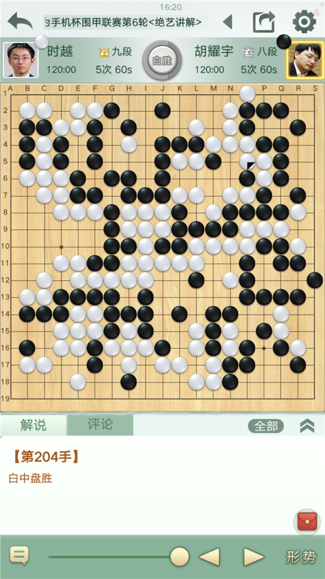 綜觀今日深圳宏發(fā)隊(duì)?wèi)?zhàn)局,頗富戲劇性!在主將申旻埈因身體不適早早失利的情況下,大家情緒較為悲觀,祈愿能拿1分就OK。但在眾隊(duì)員的奮搏之下,結(jié)局讓人大喜過(guò)望:依然以3:1大勝上海建橋?qū)W院隊(duì)!微妙的是,除了時(shí)越中盤(pán)勝胡耀宇外,另兩盤(pán)都是險(xiǎn)勝:戎毅最終贏了半目!陶欣然贏了一目半!時(shí)值深圳40周年慶典,大家都說(shuō)是宏發(fā)隊(duì)借光了!另外,大家發(fā)現(xiàn),深圳宏發(fā)隊(duì)六輪下來(lái),竟然每一輪的比分都是3:1,除了第二輪以1:3失利,其余五輪都是3:1大勝!也難怪深圳宏發(fā)隊(duì)教練羅洗河九段在賽場(chǎng)的新聞發(fā)布會(huì)上回答記者說(shuō)“深圳隊(duì)是強(qiáng)隊(duì)??!”領(lǐng)隊(duì)梁偉棠九段笑著說(shuō):“一語(yǔ)驚四座,這幾天一直回蕩在賽場(chǎng)!”有意思的是,此輪前位居前六的隊(duì)伍的都贏了下來(lái),且積分榜前三位和最后三位都沒(méi)變,只是中間微調(diào)了一下??磥?lái)沙里淘金,能挺到現(xiàn)在的都是強(qiáng)者!