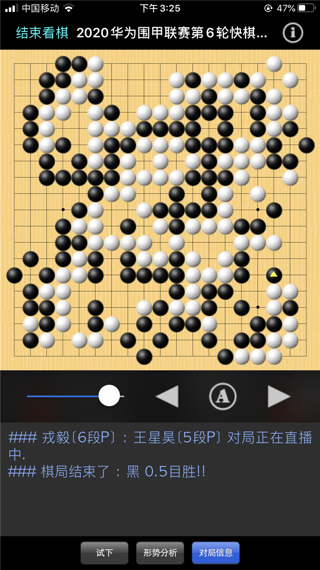 誰(shuí)料做活上面大龍時(shí)候失誤導(dǎo)致右邊被白吃掉,結(jié)果以幸運(yùn)的3/4子獲勝。