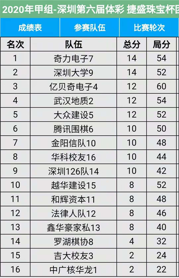 見圳客戶端?深圳新聞網(wǎng)2020年11月15日訊(記者周錦春)第六屆“體彩?捷盛珠寶杯”深圳市圍棋聯(lián)賽繼續(xù)在羅湖區(qū)藝嘉大酒店展開,今天是第三場,有第7輪至第9輪的比賽。目前,超級組中,瑞珂瑪隊、兒童棋院隊在積分榜上排名第一第二,繼續(xù)領(lǐng)先;甲級組中,奇力電子、深圳大學(xué)在積分榜上排名第一第二。具體賽程結(jié)果請看本文附后表格。