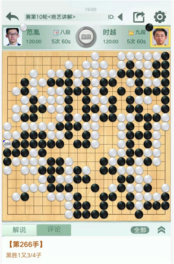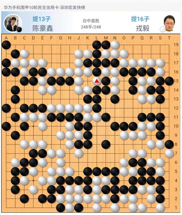 第一臺(tái),快棋,戎毅執(zhí)白勝陳豪鑫。黑棋開局在右邊以及中盤在左上的下法略嫌松緩,白領(lǐng)先。之后黑棋沖擊白棋中央致使左邊形成打劫,白棋簡明處理后以較大優(yōu)勢(shì)進(jìn)入官子。最后黑棋為了強(qiáng)撐一目棋在自己空里出現(xiàn)打劫,在黑棋需要找很損的劫材時(shí)候黑方認(rèn)輸。