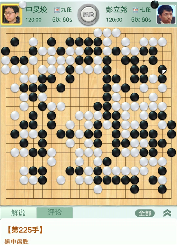 第三臺慢棋,由深圳隊外援申旻埈九段執(zhí)白對陣彭立堯七段。開局右邊黑棋行棋過分,但白棋對殺時出現(xiàn)較大失誤,將雙活走成被殺,黑棋大幅領(lǐng)先。之后黑棋右上角又出現(xiàn)失誤,將一塊棋送死,局面接近。上方作戰(zhàn)雙方都有一定的失誤,形勢劇烈波動,最終形成打劫。黑棋依仗劫材有利,放棄左上角將右上吃掉白棋棋筋活出,便宜巨大,獲得最終勝利,申旻埈執(zhí)白中盤負(fù)彭立堯。這一盤,教練羅洗河九段認(rèn)為“下得是真奇葩!”