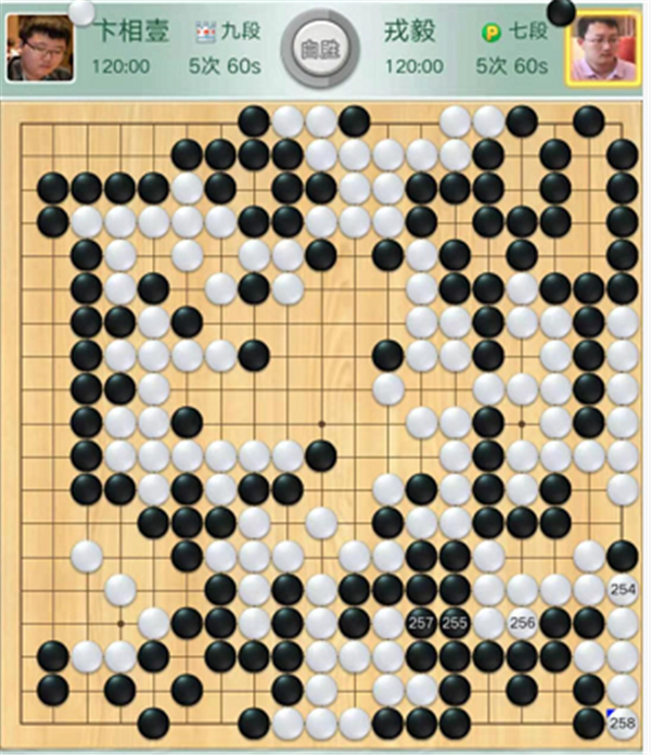 第二臺主將臺,由深圳隊戎毅七段執(zhí)黑對陣江西隊外援卞相壹九段。開局黑取實地白取外勢,局面接近。中盤黑棋在中央放棄出頭花兩手棋吃掉左下角白棋稍小,白棋棄角后圍住中央巨空,白稍好。官子階段白棋左上形狀處理有誤,黑棋未能抓住沖擊機(jī)會,選擇大幅退讓,最終目數(shù)不夠。戎毅執(zhí)黑負(fù)卞相壹。