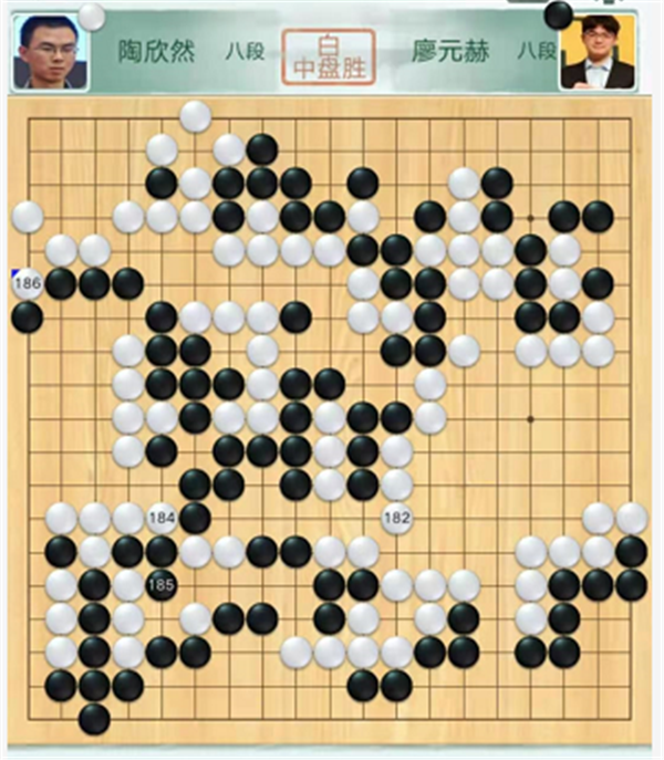 第四臺慢棋,由深圳隊(duì)陶欣然八段執(zhí)白對陣成都隊(duì)廖元赫八段。中央戰(zhàn)斗時候白棋選擇退讓,反倒形成打劫,黑棋劫勝后大幅領(lǐng)先。之后黑棋官子階段不夠冷靜細(xì)膩,幾處小虧損之后被白反超。黑棋看到局面危險(xiǎn)更加沖動的選擇和白棋互相破空,結(jié)果又虧損導(dǎo)致差距越來越大。陶欣然執(zhí)白中盤勝廖元赫。