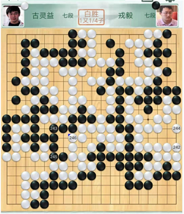 第三臺快棋,深圳隊(duì)的戎毅七段執(zhí)黑對陣成都隊(duì)的古靈益七段。黑棋開局采取取地策略。下方黑棋形狀處理保守,子效重復(fù)虧損。之后黑棋一直沒有明顯勝機(jī),最終以1又1/4子落敗。戎毅執(zhí)黑1又1/4子負(fù)古靈益。
