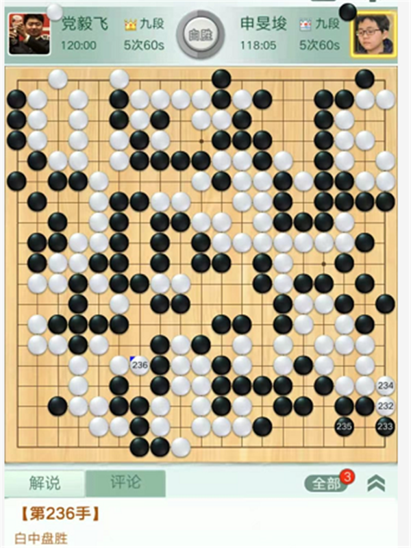 第一臺慢棋,由深圳隊(duì)的外援申旻埈九段執(zhí)黑對陣成都隊(duì)的世界冠軍黨毅飛九段。右下角白棋出現(xiàn)失誤,黑棋沒有抓住機(jī)會反而被白棋便宜不少。之后黑棋頑強(qiáng)追趕局面一度接近。但是官子階段黑棋始終沒有發(fā)現(xiàn)左上角官子便宜的小巧手,被白消除隱患后,白勝勢。申旻埈執(zhí)黑中盤負(fù)黨毅飛。