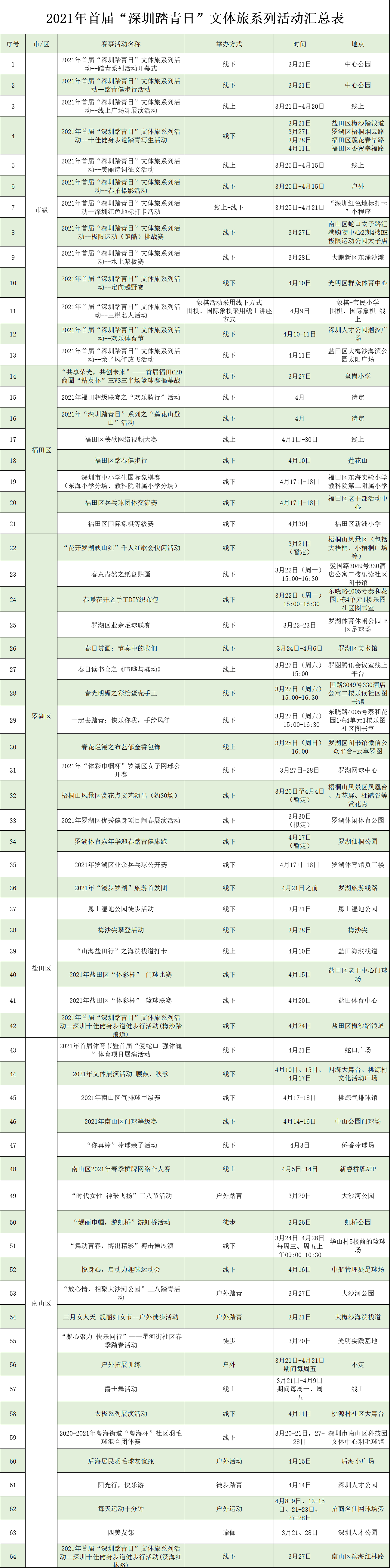據(jù)了解,“深圳踏青日”系列活動將為市民提供豐富多樣的“踏春”體育文化旅游資源,如“歡樂體育節(jié)”、“打卡活動”以及各項體育賽事與文化活動都將陸續(xù)推出。其中,“深圳十佳健身步道”打卡活動,鼓勵市民走出家門,走進蓮山春早路、梧桐煙云路、梅沙踏浪道、濱海紅林路、梅林青石路、陽臺疊翠路、石巖湖光路、香蜜幸福路、青春大運路、光明山湖道等最美健身步道領(lǐng)略春天氣息。而打卡深圳紅色地標活動,則是邀請市民前往前海石公園、蓮花山公園、深圳改革開放展覽館、中國文化名人大營救紀念館、白花洞革命烈士紀念碑(紀念園)、東縱紀念館、寶安一大紀念館等學(xué)習(xí)歷史傳承。