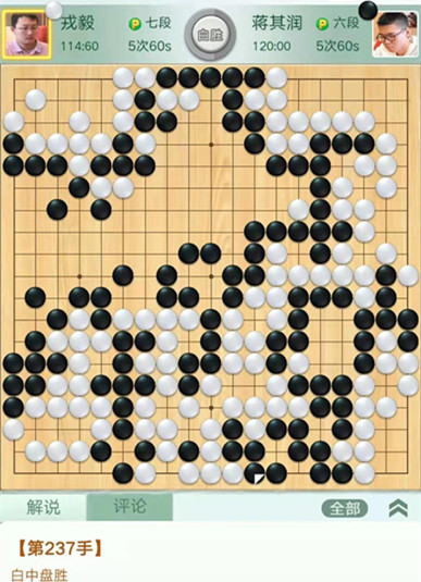 戎毅執(zhí)白對陣蔣其潤。開局白取地中央黑模樣巨大,白淺消后黑棋攻擊不當(dāng),被白活出兩塊棋后白棋領(lǐng)先。之后黑棋左下棄子圍空又虧損,白棋以較大優(yōu)勢獲得勝利。