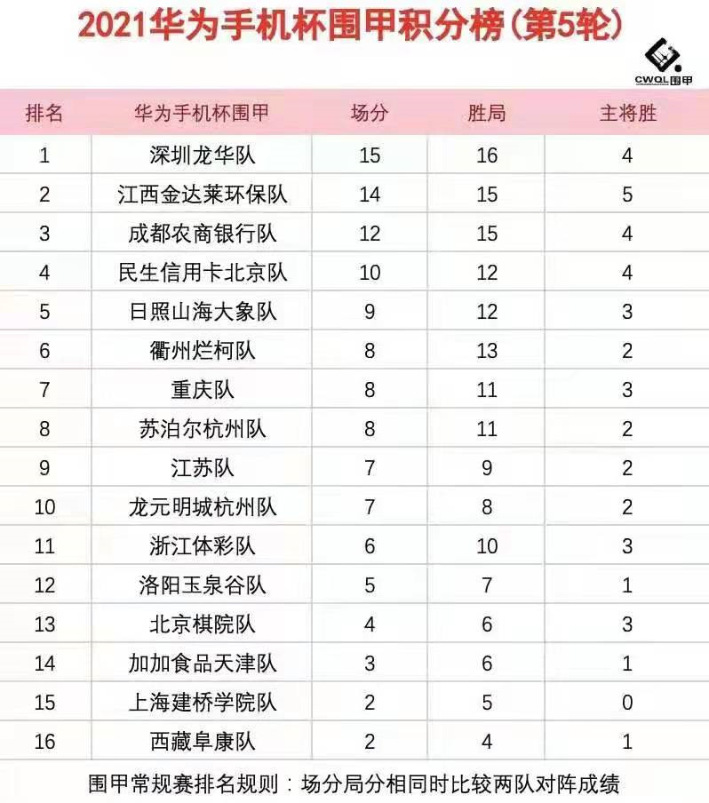 第五輪各隊?wèi)?zhàn)況如下:衢州爛柯4比0勝加加食品天津;浙江體彩隊1:3深圳龍華隊;日照山海大象隊1:3江西金達(dá)萊環(huán)保隊;重慶隊3比1民生信用卡北京隊;成都農(nóng)商銀行隊3:1勝江蘇隊;西藏阜康2:2主將勝上海建橋?qū)W院;北京棋院隊2:2主將勝洛陽玉泉谷隊;蘇泊爾杭州2:2主將負(fù)龍元明城杭州。第一階段結(jié)束,深圳龍華隊五戰(zhàn)全勝積15分居“魁首”,江西金達(dá)萊環(huán)保隊僅以一分之差緊隨其后,成都農(nóng)商銀行隊積12分居第三位。
