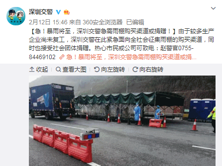 見圳客戶端·深圳新聞網(wǎng)2020年2月14日訊 2月12日下午約4時,深圳交警官方微博的一條消息牽動了深圳紅牛負(fù)責(zé)人張健明的心。該微博寫道:“急!暴雨將至,由于較多生產(chǎn)企業(yè)尚未復(fù)工,深圳交警在此緊急面向全社會征集雨棚的購買渠道,同時也接受社會團(tuán)體捐贈?!?/span>