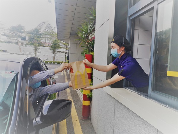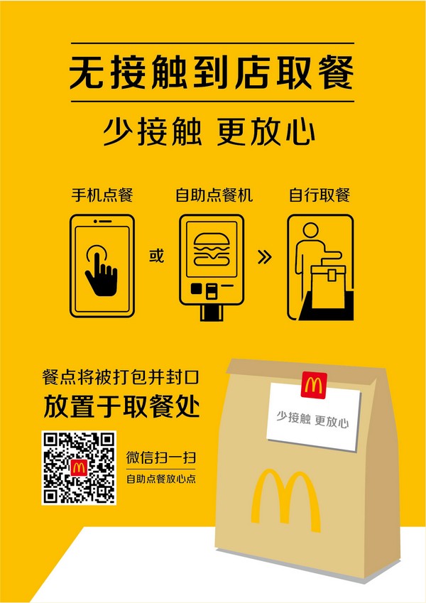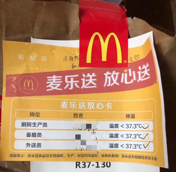 為了讓顧客放心,麥當(dāng)勞在安全服務(wù)的前提下,餐廳實(shí)施“無(wú)接觸配送”和“無(wú)接觸到店取餐”。所有外送訂單均附上“麥樂(lè)送放心卡”,標(biāo)注生產(chǎn)、配膳、外送人員姓名及體溫,做到餐品、人員可追蹤。顧客可選擇讓外送員將餐品送到指定位置取餐,在手機(jī)、餐廳自助點(diǎn)餐機(jī)或柜臺(tái)點(diǎn)餐后,無(wú)論堂食或外帶,員工都會(huì)將制作好的餐點(diǎn)裝入打包袋并封口,放置到取餐處。
