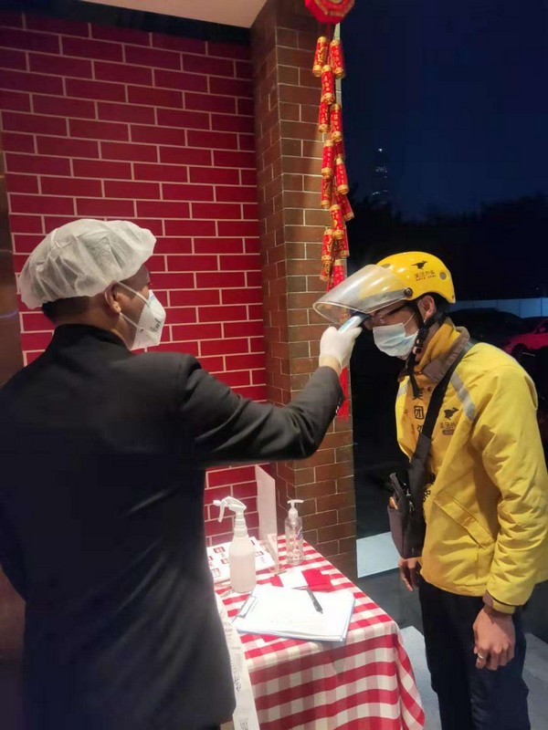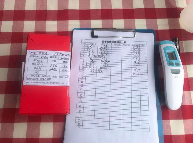 為了保障顧客和員工的健康,深圳西貝要求所有上班前的員工都需每半小時測一次體溫,每一個小時集中進(jìn)行洗手消毒,公司還為每一位員工配備了符合要求的防護(hù)口罩。不僅如此,來外賣取餐的騎手也和店員分割開在店門口取餐,減少人員之間相互交流與接觸,每個騎手取餐前,必須接受體溫測量,手部消毒,確認(rèn)無誤,才可取餐。