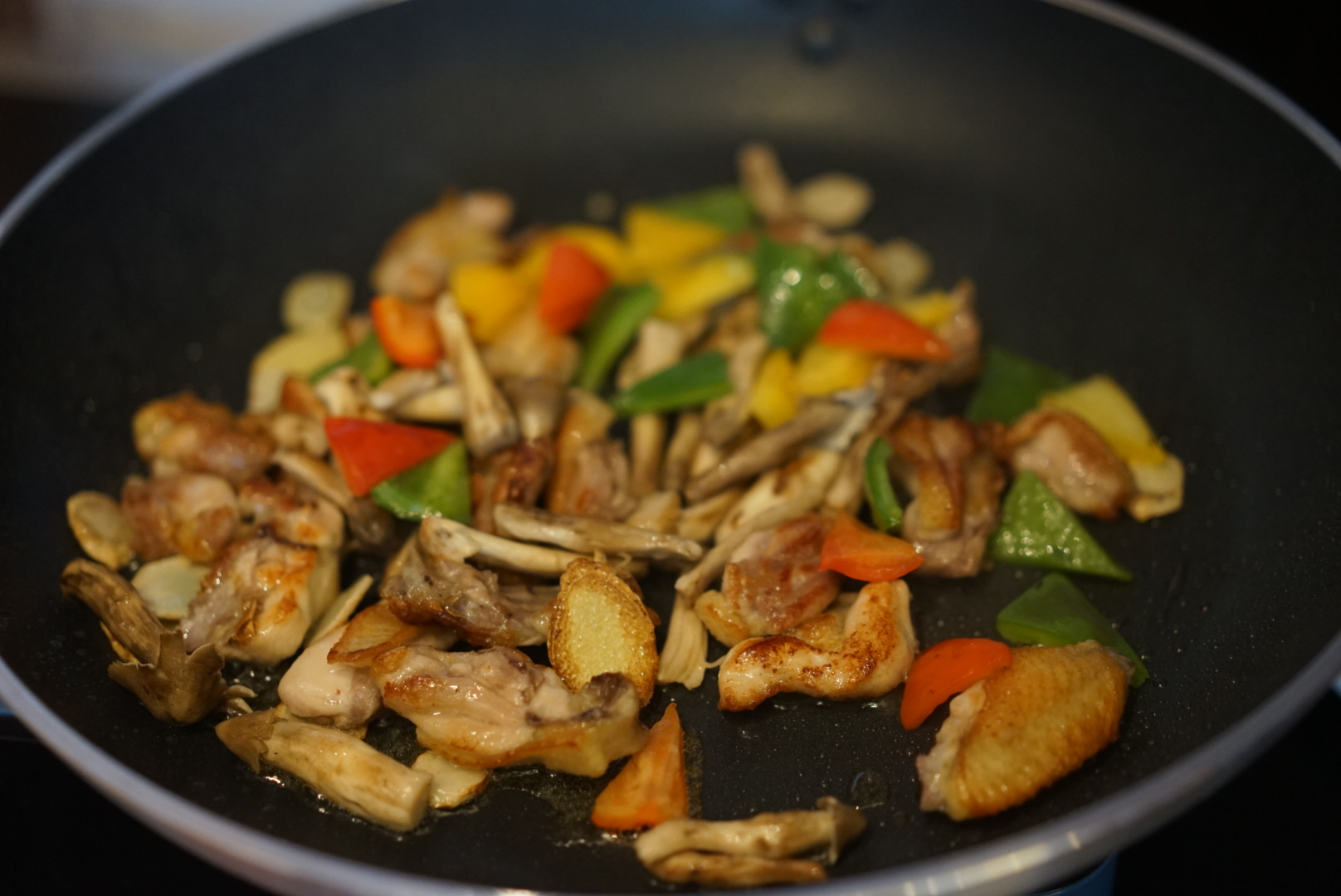 雞樅菌150克、雞肉400克、姜片50克、沙姜30克、青紅椒50克、二鍋頭30克,蒜粒、紅蔥頭