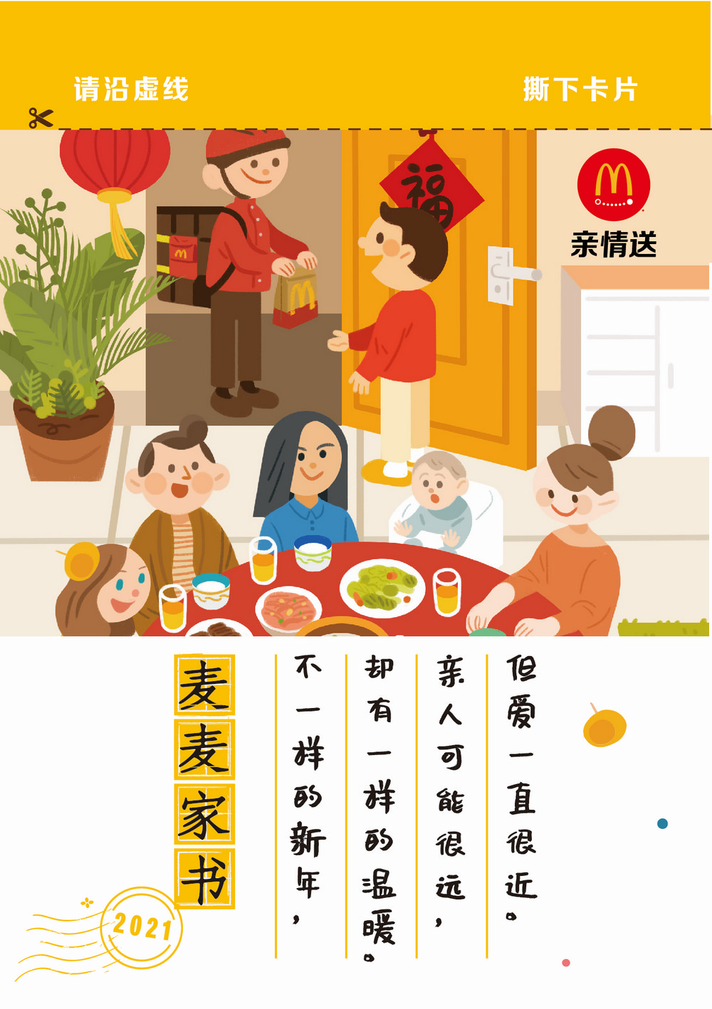 為了讓分隔兩地的顧客表達(dá)對(duì)彼此的思念和祝福,麥樂(lè)送于春節(jié)期間推出“親情送”服務(wù)。2月10日至2月17日,在i麥樂(lè)送小程序、麥當(dāng)勞App、美團(tuán)麥當(dāng)勞店鋪、餓了么麥當(dāng)勞店鋪,顧客可以選擇“親情送”服務(wù),為遠(yuǎn)在異地的親人朋友點(diǎn)餐,麥樂(lè)送會(huì)在訂單中附上【親情卡】,消費(fèi)者可以定制祝福,卡片連同美食將一齊送達(dá)你思念的人手中。